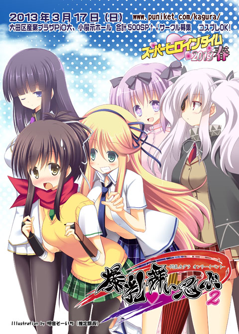 このイベントはスーパー女の子オンリー集合イベント 「スーパーヒロインタイム2013春」の一環として行われ、入場、及びカタログは共通となります。 オンライン申込みは、当ページの申込みフォーム(全イベント共通)から出来ます。 参加要項をよく読んだ上でお申し込みください。 あなたは 参加資格 閃乱カグラをこよなく愛し、同人活動をされている方なら、どなたでも参加可能です。 爆乳舞い忍ぶ22013年3月17日(日)11:00-15:00 大田区産業プラザPiO 1F大、小展示ホール スーパーヒロインタイム2013春内 直接参加のみ合計最大500↑↓スペース募集 即売会終了後におたのしみイベントあり! サークル参加満了御礼! 多数の参加申込みありがとうございました。 3/17開催 スーパーヒロインタイム2013春 サークル配置リスト 今回応募者多数のため抽選および書類不備等の方を落選とさせていただきました。 このリストに掲載されているサークルは当選になります。 全サークルにサークル案内発送しました(2/26発送) カタログについて ・以下の同人書店にて前売りします。 とらのあな、メロンブックス、まんだらけ、ZIN、 (なお、販売店舗につきましては、各書店の方まで直接お問い合わせください。) ・以下の同人イベントにて前売り予定です。 3/3 みみけっと28(ベルサール新宿グランド)あ19、20 メルヘンBOX 3/10 月の宴(大田区産業プラザPiO) 本部にて予定 リンクフリーです。バナーはこちら。 ※このHPはWindows版InternetExplorer6(IE6)とFireFox(Modzilla)にて動作確認を行っております。 |